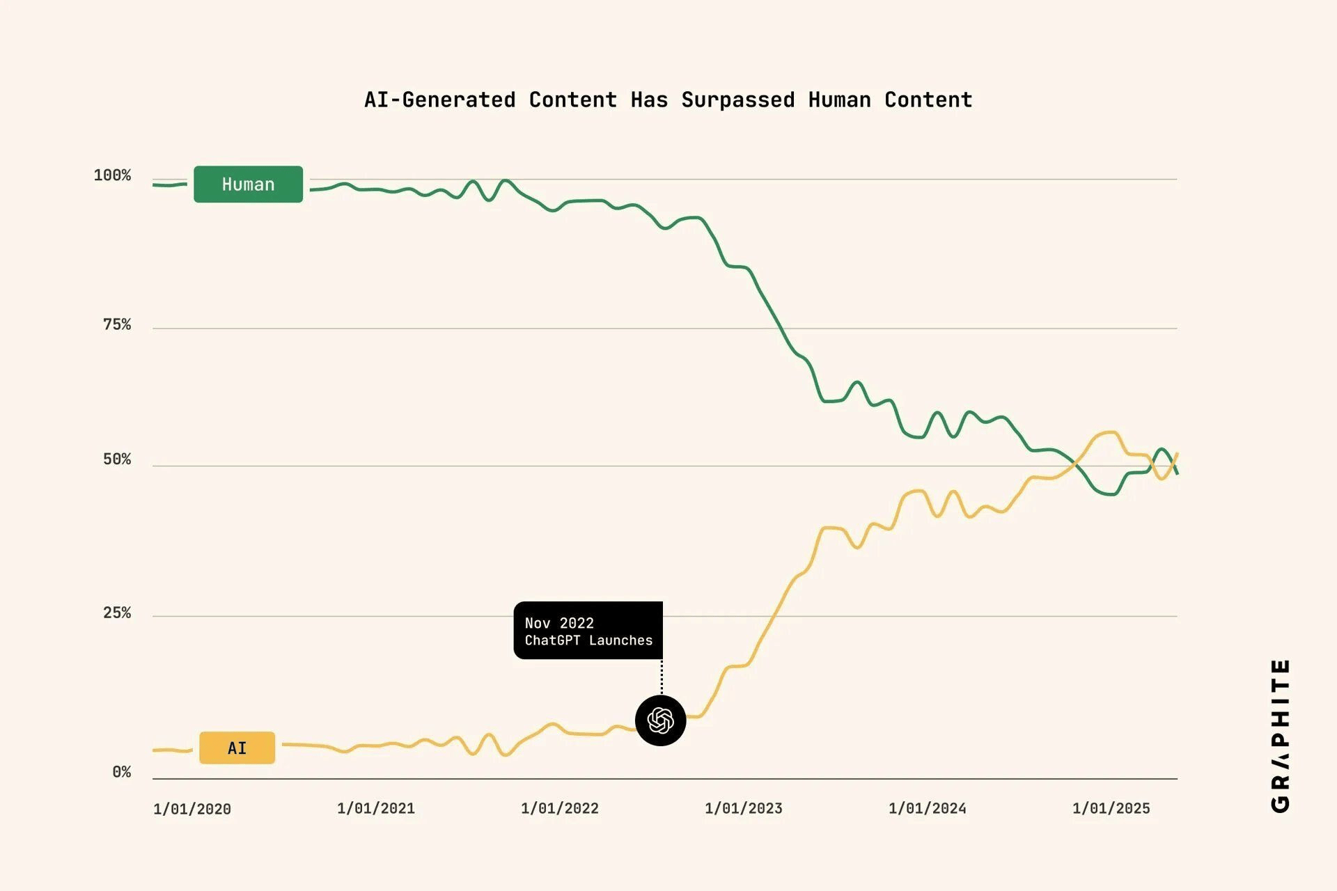 A new study from SEO firm Graphite analyzed 65,000 articles and found that over 50% were AI-generated by May 2025, up from 39% a year after ChatGPT launched.